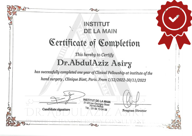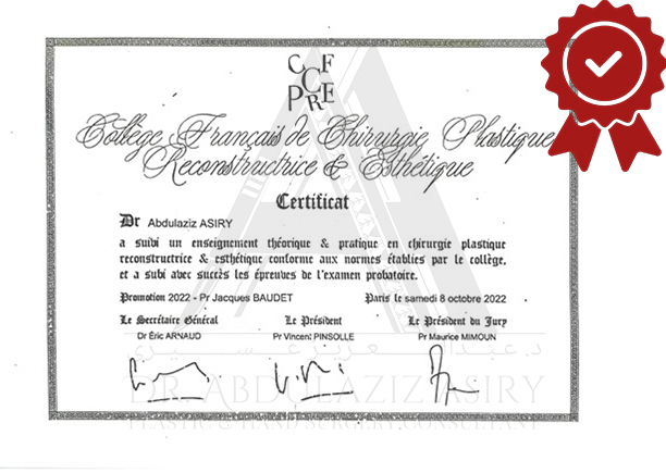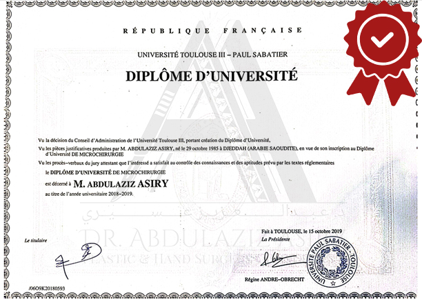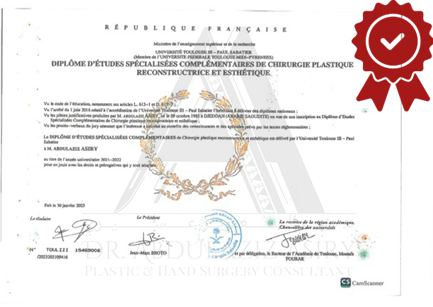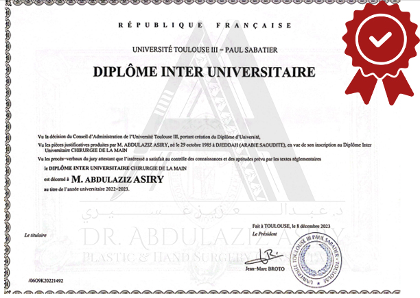 Pursuing advanced specialization, Dr. Asiry moved to France where he completed intensive training in Plastic and Reconstructive Surgery at Toulouse III University (Paul Sabatier). Over seven years, he immersed himself in both clinical practice and academic study, becoming fluent in French and earning multiple prestigious qualifications, including: