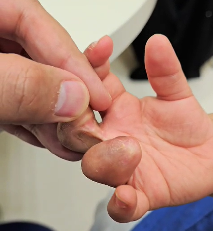 Suite à ce premier traitement, des adhérences sévères se sont développées, limitant considérablement les mouvements des doigts et de la main.